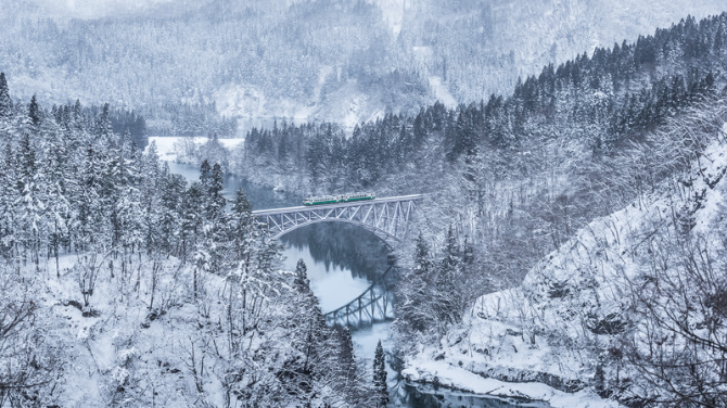 Thị trấn Tadami nằm trên núi nên khung cảnh sẽ cực kỳ đẹp vì vừa có núi, vừa có hồ lại có cả hai dòng sông Ina và Tadami chảy qua. Khung cảnh còn thêm phần lãng mạn nếu bạn ngắm nhìn ở góc có đường tàu Tadami bắc qua. Đây cũng là vùng tuyết rơi dày nhất Nhật Bản nên mùa đông nơi đây toàn bộ các cánh rừng và sườn núi được phủ dưới lớp tuyết dày trắng xóa, cực kỳ đẹp cho những khung hình sống ảo.
